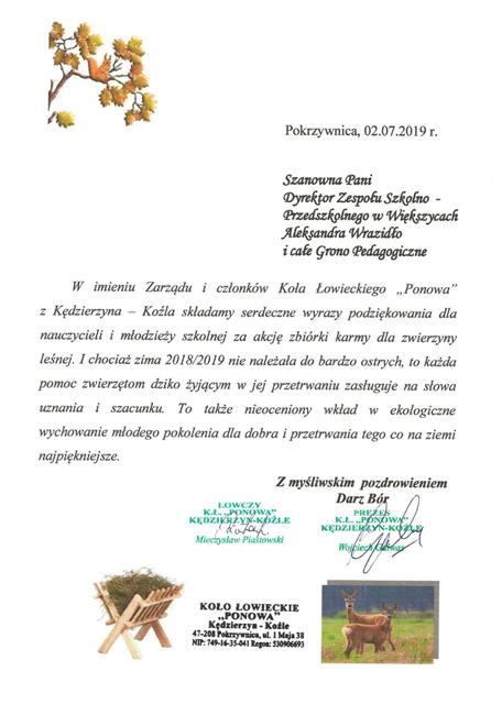 Podziękowanie Koło Łowieckie \"Ponowa\"
