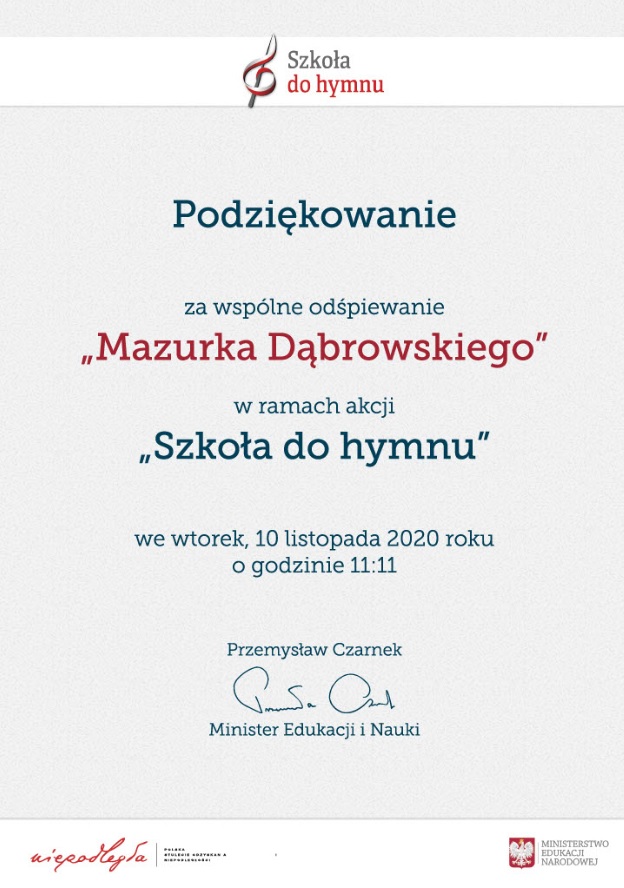 Podziękowanie za wspólne odśpiewanie „Mazurka Dąbrowskiego” w ramach akcji „ Szkoła do hymnu” 2020
