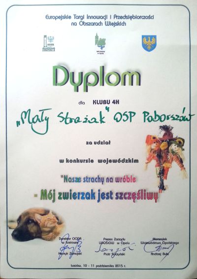 Opolski Ośrodek Doradztwa Rolniczego w Łosiowie w ramach kolejnego Zlotu Klubów 4H ogłosił konkurs plastyczny pt. "Mój zwierzak jest szczęśliwy". Celem konkursu było zapoznanie dzieci z tematem ochrony, odpowiedniego traktowania oraz opiekowania się zwierzętami w naszych domach i gospodarstwach rolnych oraz uwrażliwienie na krzywdę zwierząt oraz łamanie ich podstawowych praw. Konkurs polegał na wykonaniu stracha na wróble z podobizną szczęśliwego zwierzaka domowego, który organizowany był dla dzieci i młodzieży z obszarów wiejskich województwa opolskiego zrzeszonych w klubach 4H, działających przy szkołach podstawowych i gimnazjach publicznych oraz przy organizacjach wiejskich. Wspaniałe prace dzieci/młodzieży zostały nagrodzone w dniach 10-11 października 2015 r. podczas Europejskich Targów Innowacji i Przedsiębiorczości na Obszarach Wiejskich, które obyły się w Łosiowie. Uczniowie kl. III Szkoły Podstawowej w Poborszowie z wychowawcą p. Krystyną Gabor wzięli udział w konkursie. Niestety ze względu na tak wielką rozpiętość wiekową – od klas młodszych po gimnazjum otrzymaliśmy tylko nagrodę za udział. Jesteśmy jednak zadowoleni, gdyż nagrodą był dyplom, pendrivy, książki, gra liczbowa „Remik” , którą wykorzystamy do zabawy edukacyjnej na zajęciach i przerwach.